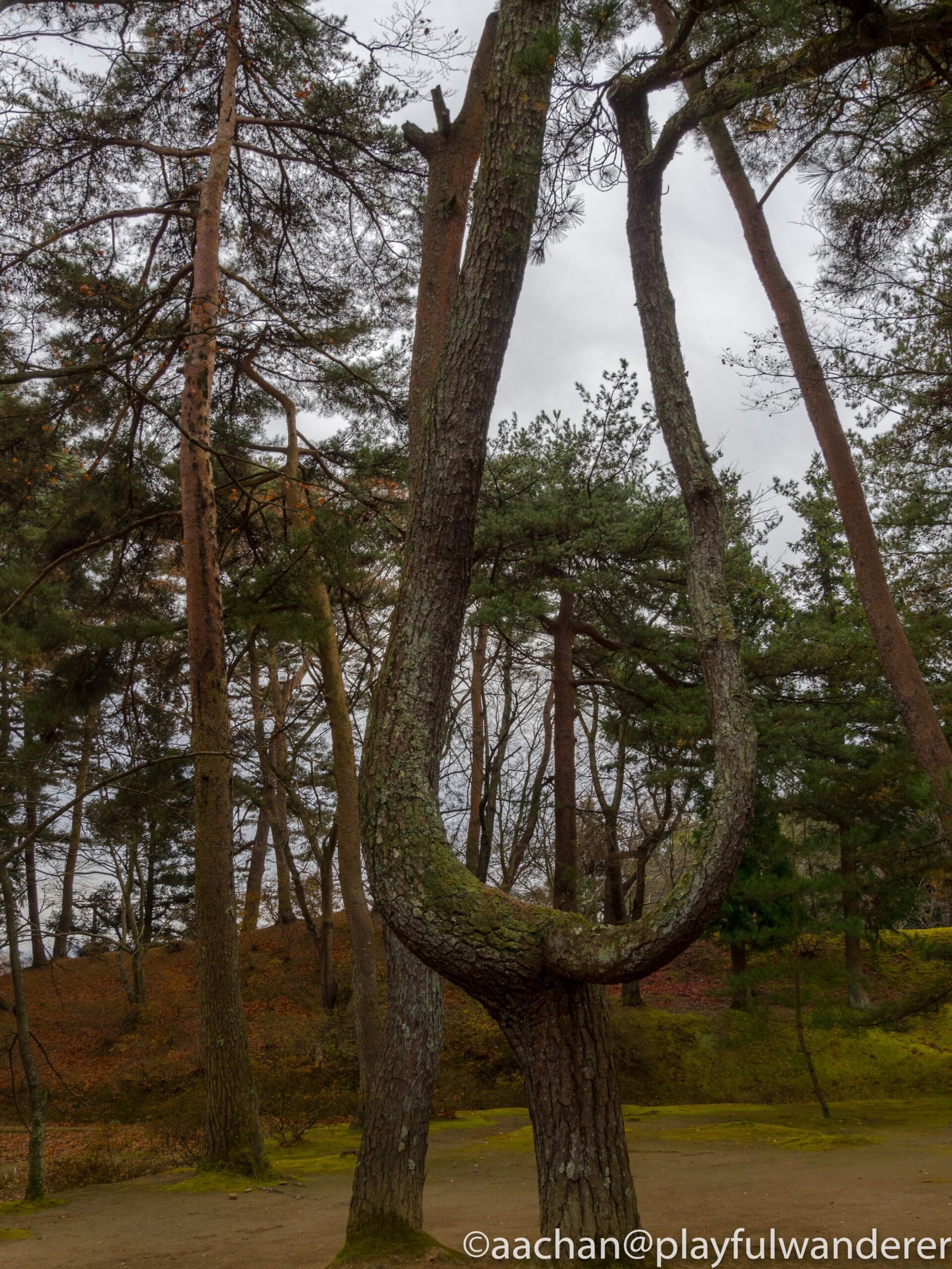 開山堂脇には変わった形の松が何本もある。見事なU字型の間に弦を貼れば天使のリラのようだ。