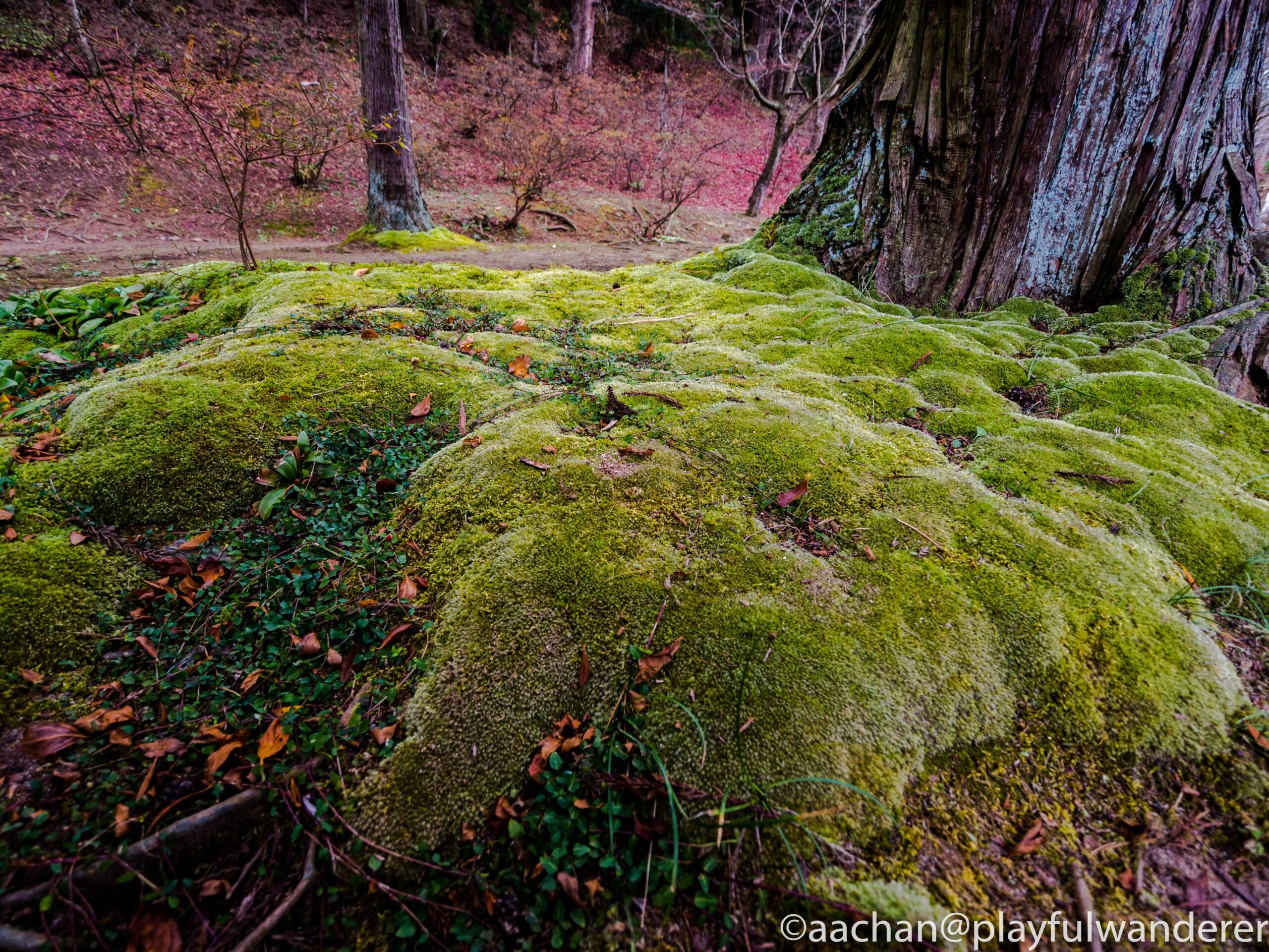 樹木の根元は、鮮やかでとても良い雰囲気に数種類の苔が覆っている。