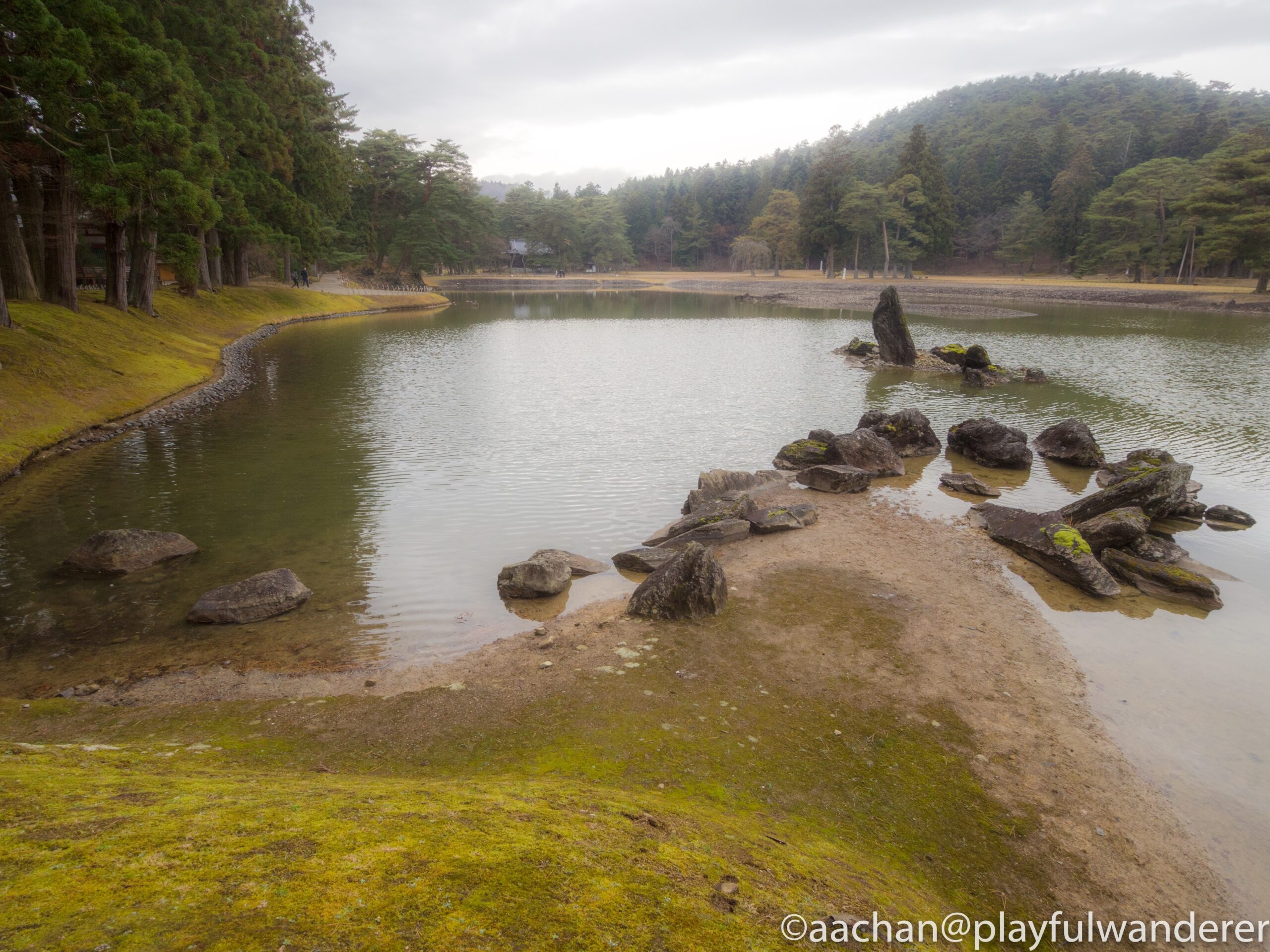 この立石、3.11の時に傾いてしまったらしく、池の水を抜いて角度を戻したのだそうな。