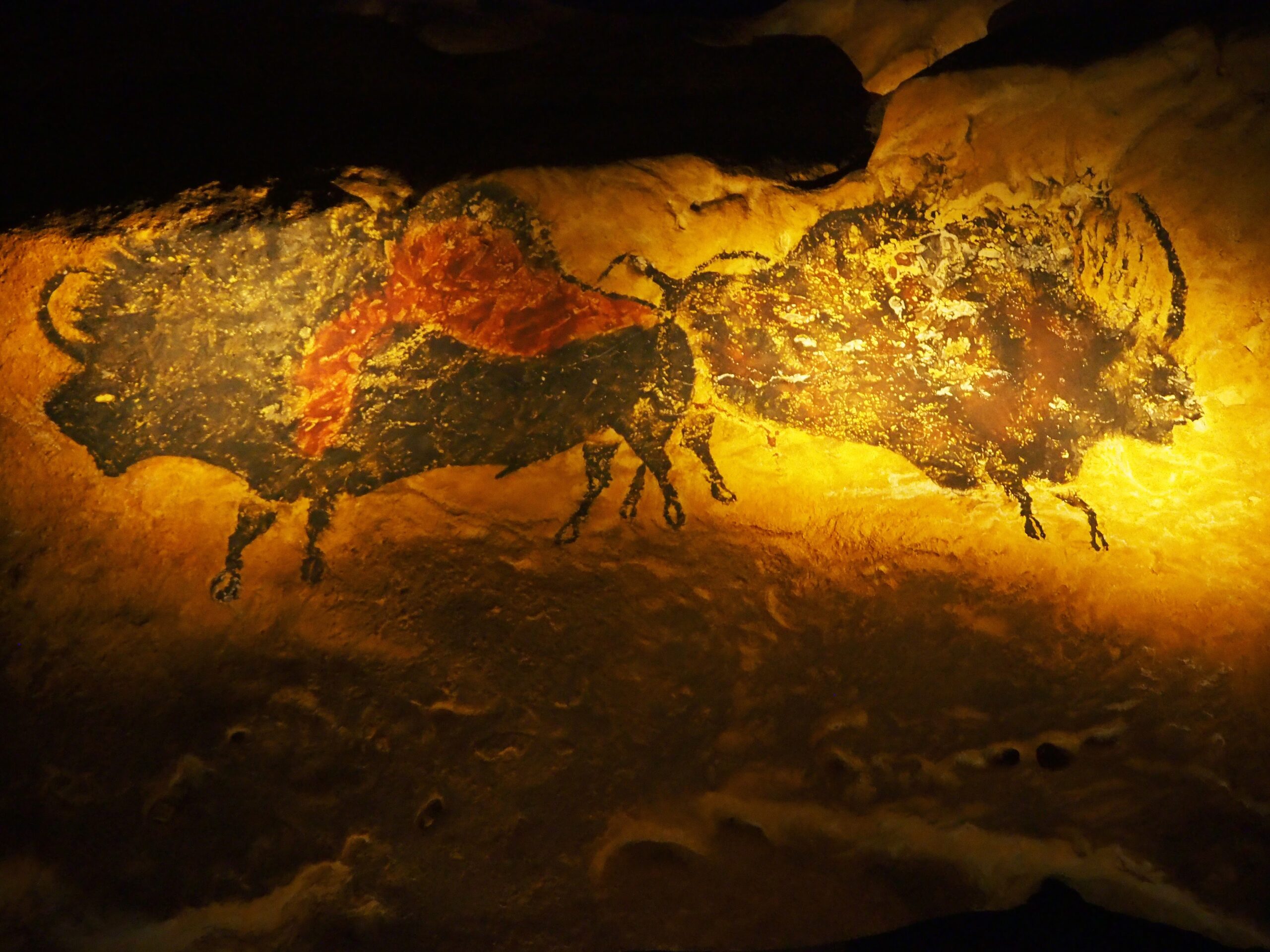 しかし驚くべきは右側のバイソンをよーく見ると、腹に槍のようなものが突き刺さり、中からどばーと内臓のようなものが飛び出している。