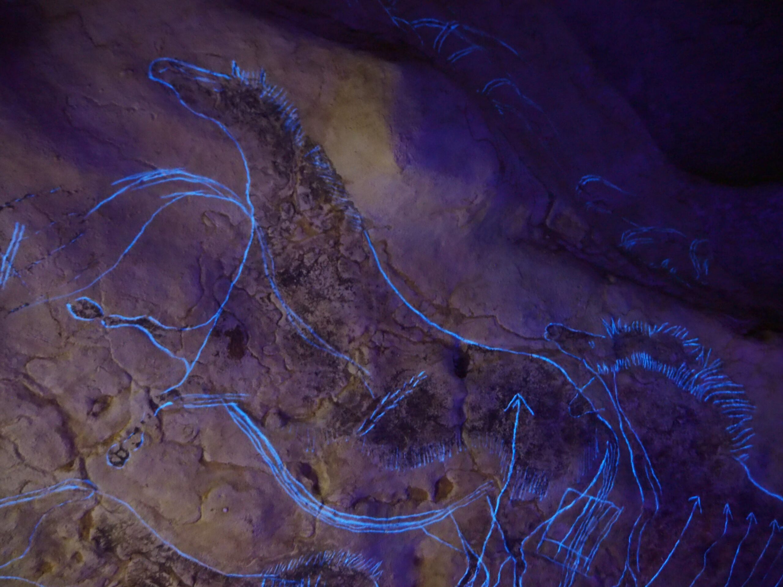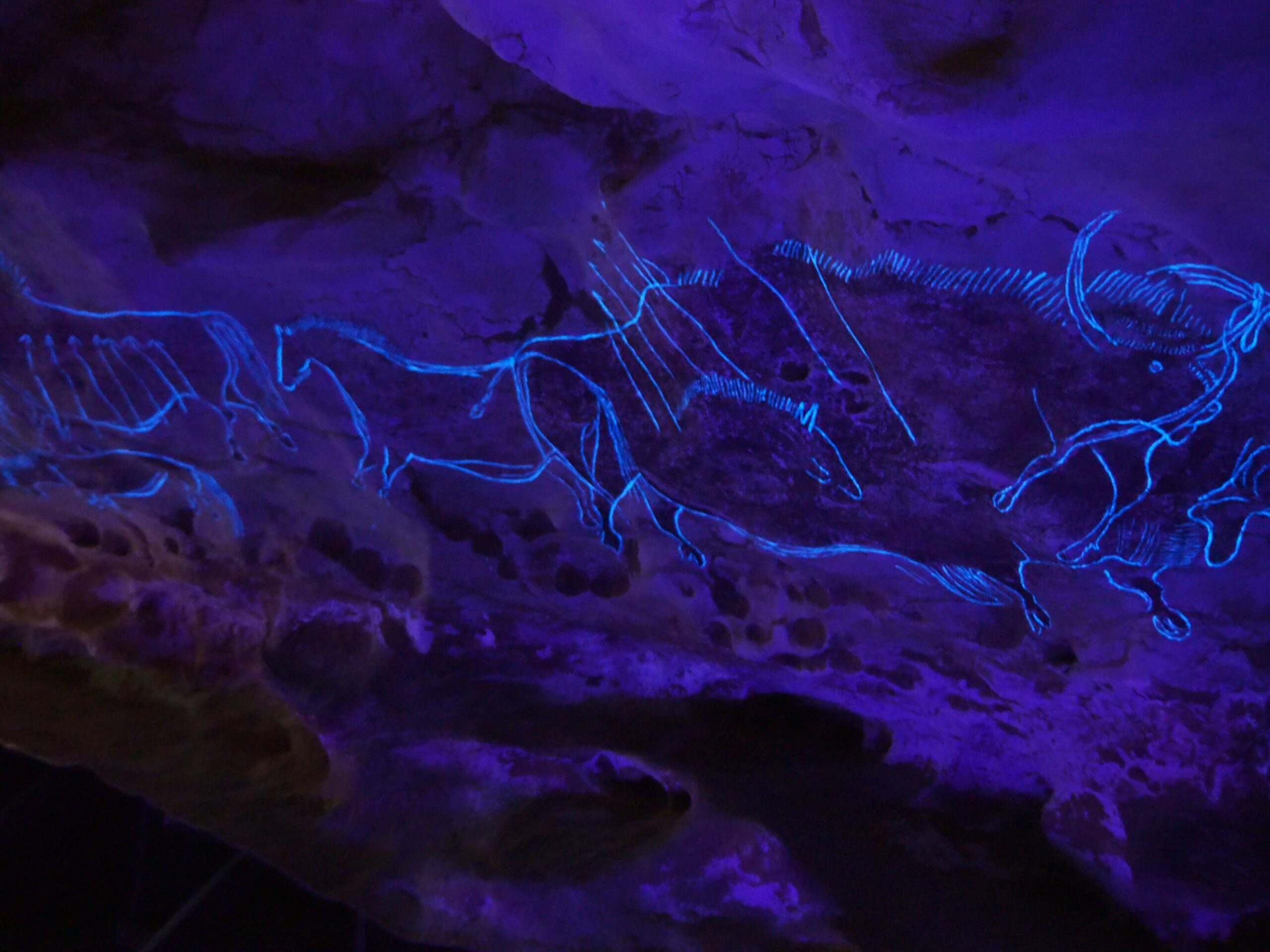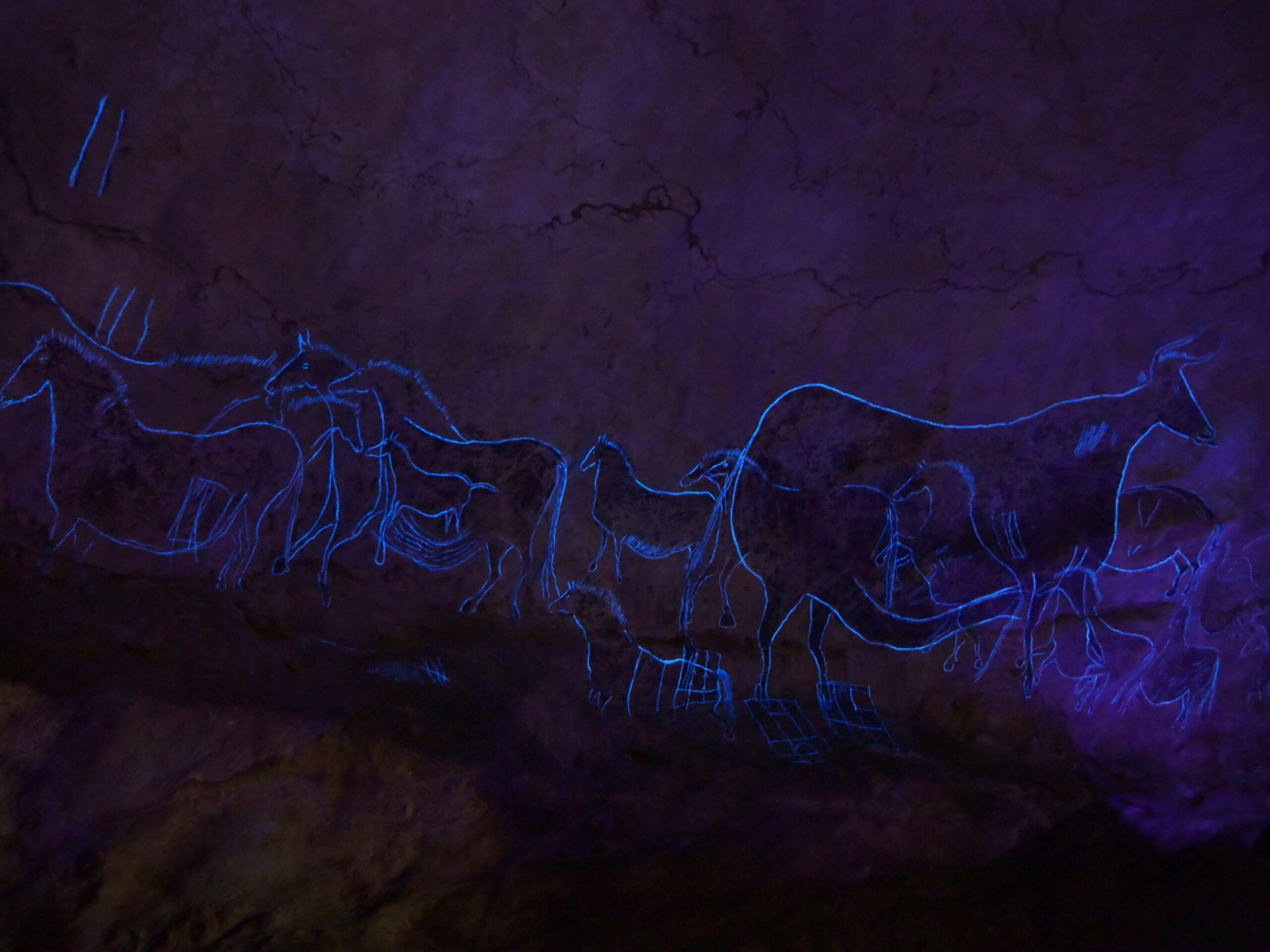 時間で通常ライトとブラックライトが切り替わり、線刻がくっきりと浮かび上がる仕組み(一部の壁画)が使われており、さらに光量は厳しい状況となる。