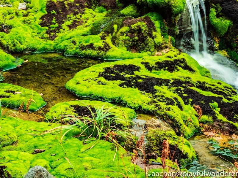 停車場から登っていくと滝がまず目につく。この周辺の岩に生えてるのもチャツボミゴケなのでしょう。