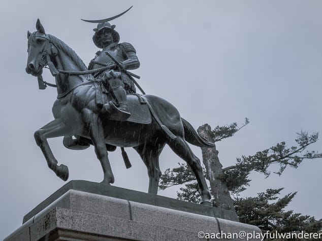 そして現在の青葉城跡のシンボルと言えばこれ。伊達政宗騎馬像ですね。(見上げると雨が。。。)