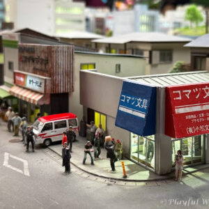 絵画の目の錯覚の要領で、ほんとは箱型ではない遠近感を感じさせる形状に作られてるんです。ははぁこういう手法もあるんだなと勉強になりました。人物の配置も情景を引き立たせるのに的確でよいですね。