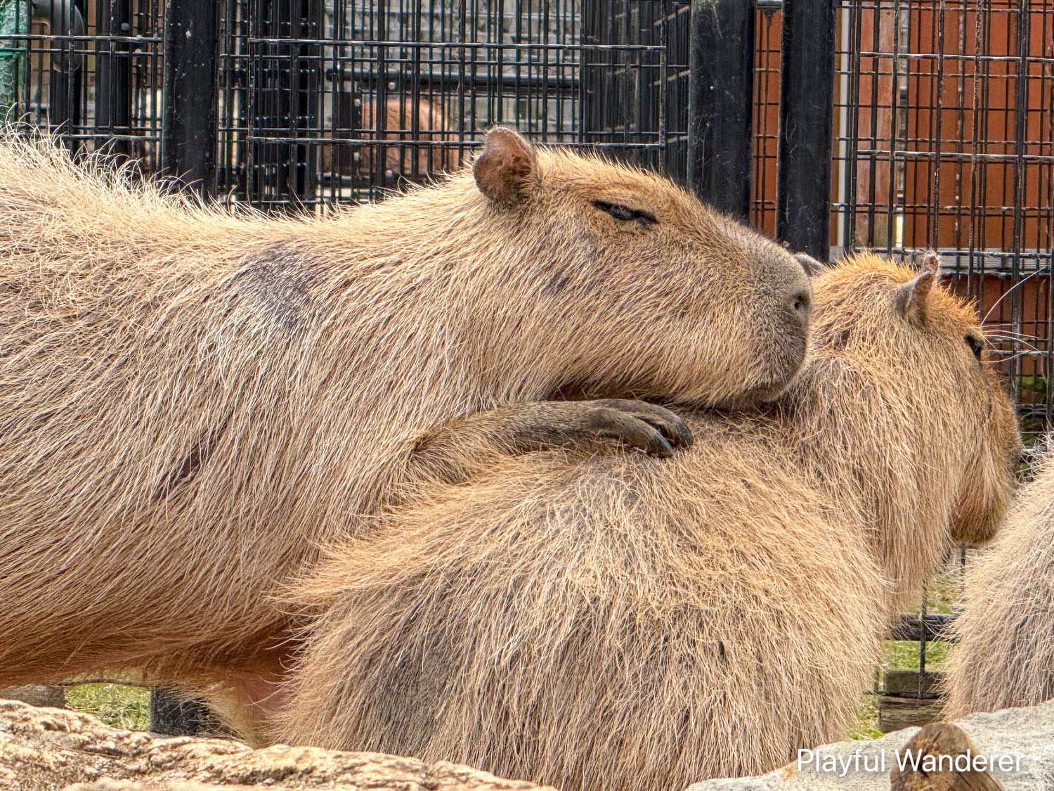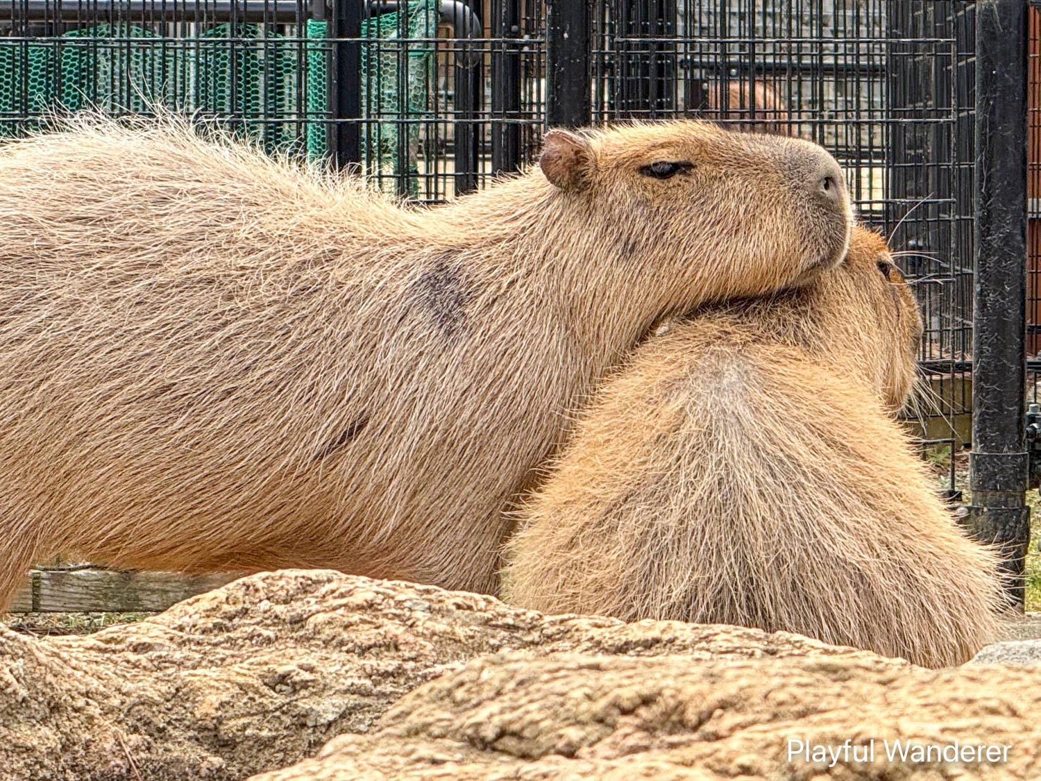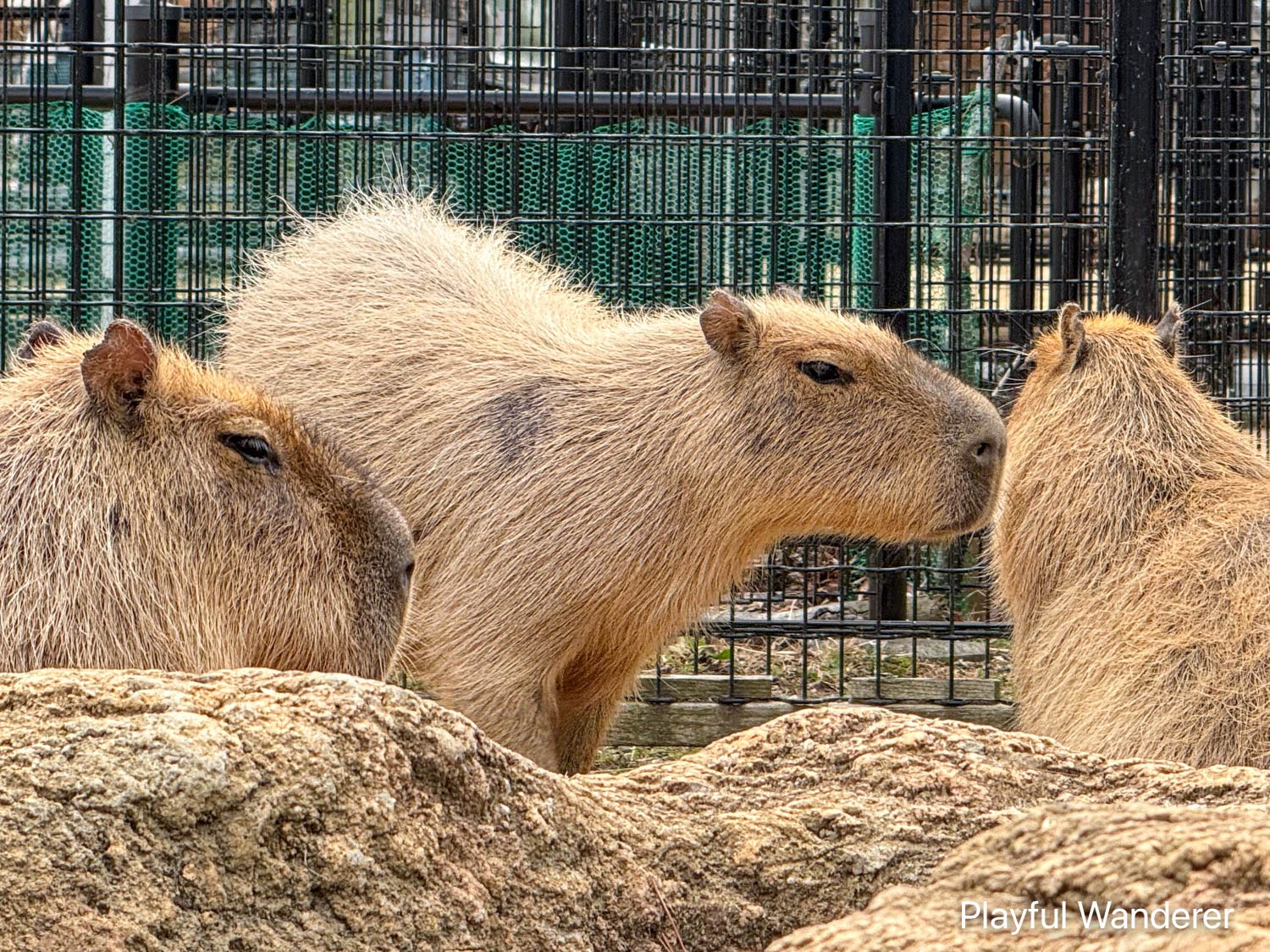 中央のふれあいの丘のあたりもまた変わってました。以前バードショーの練習とかしてたとこがふれあい牧場となり、カピバラゾーンも屋外に広くなってました。