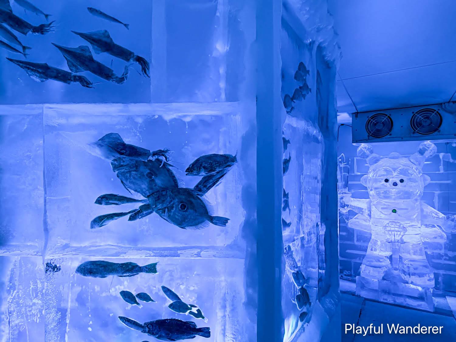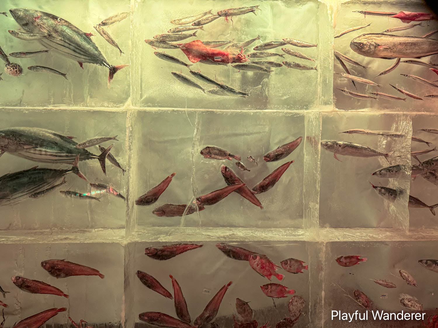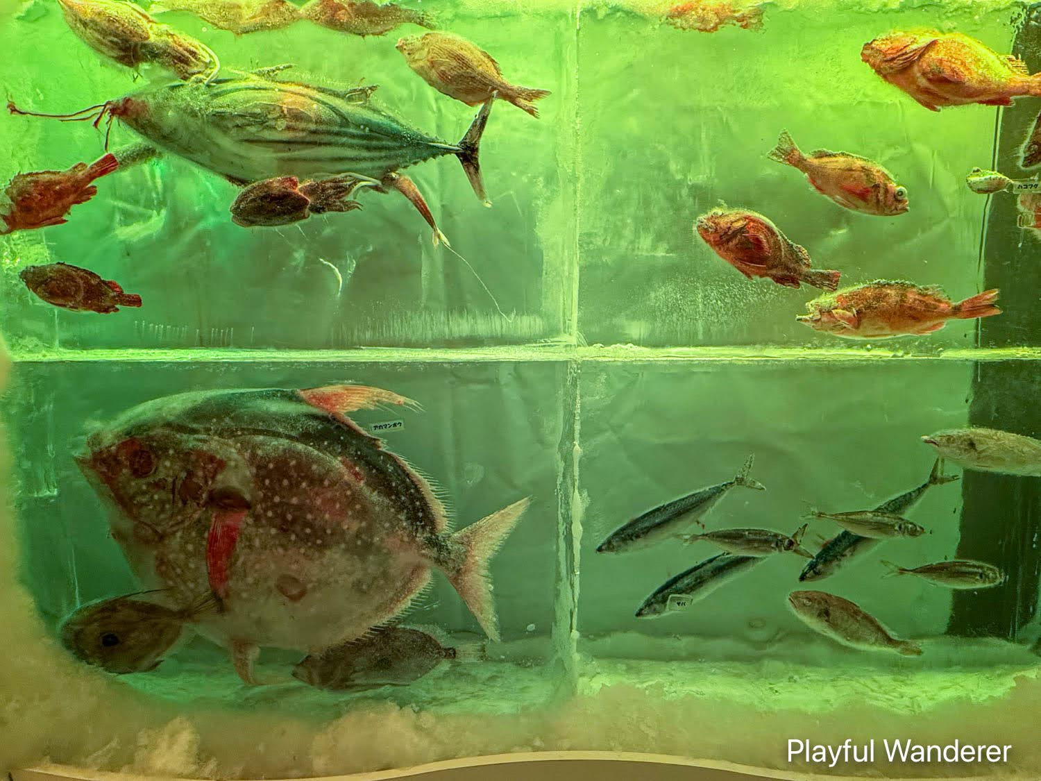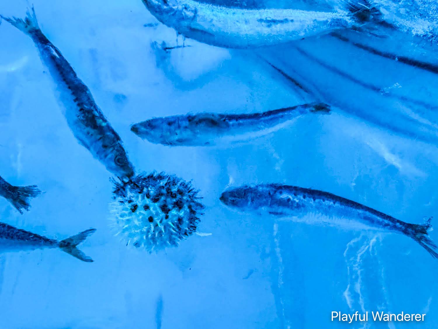 氷の水族館とは、ずばり氷に閉じ込めた鮮魚たちを海中風景になぞらえて展示している水族館。