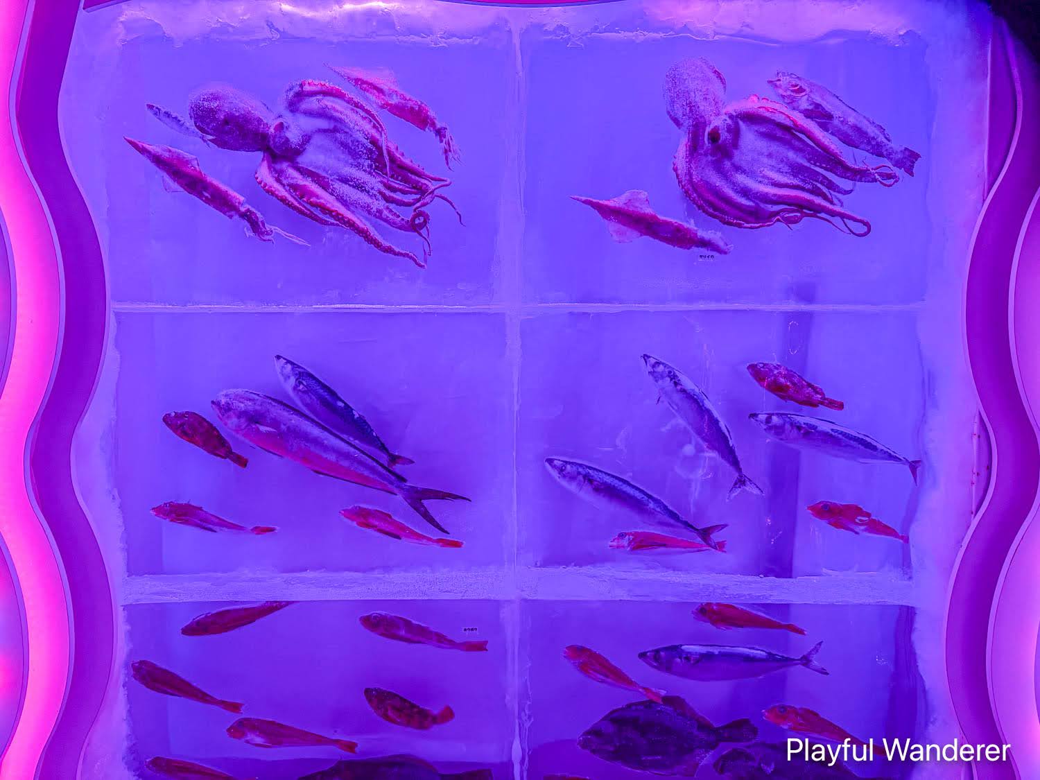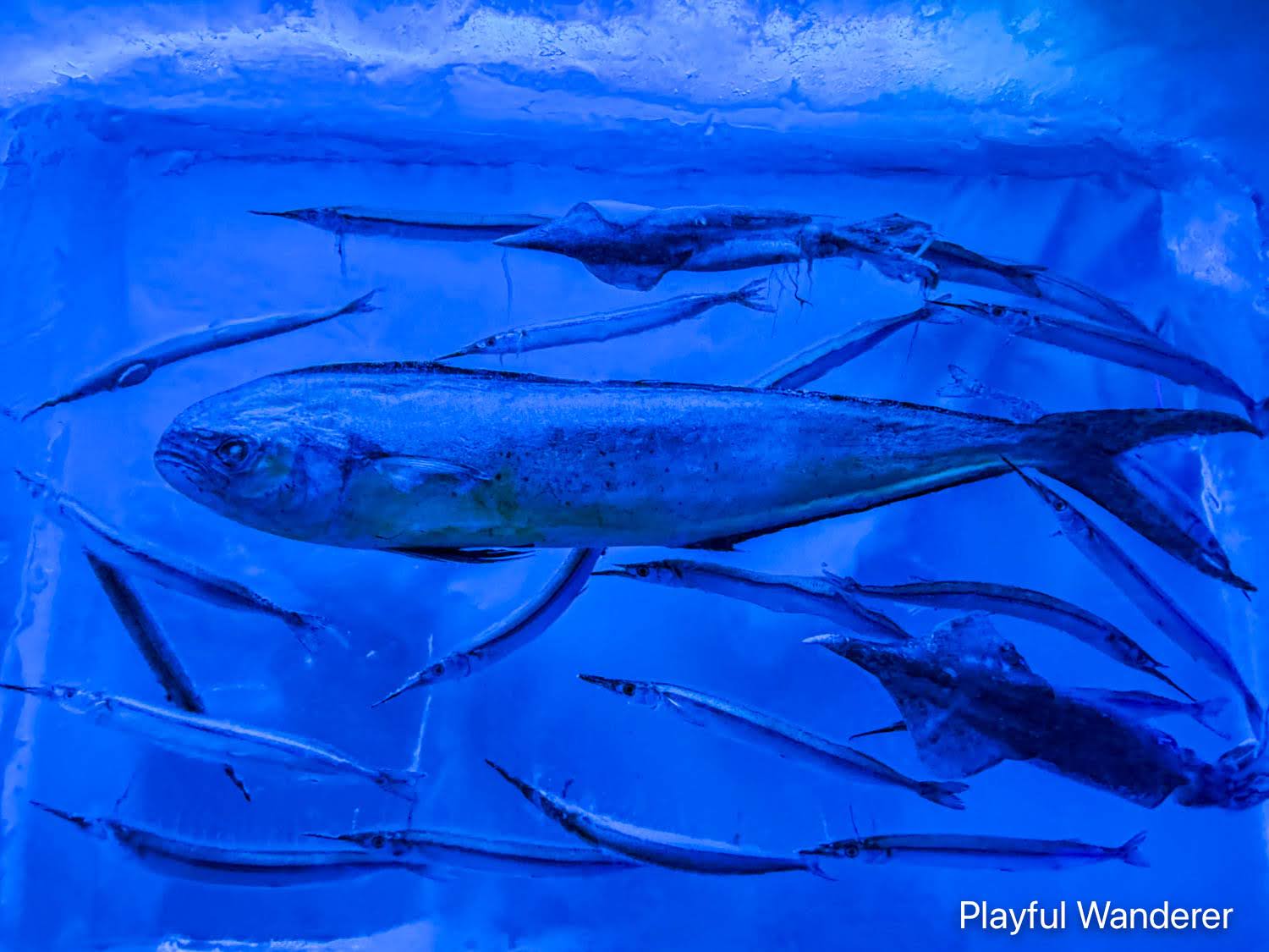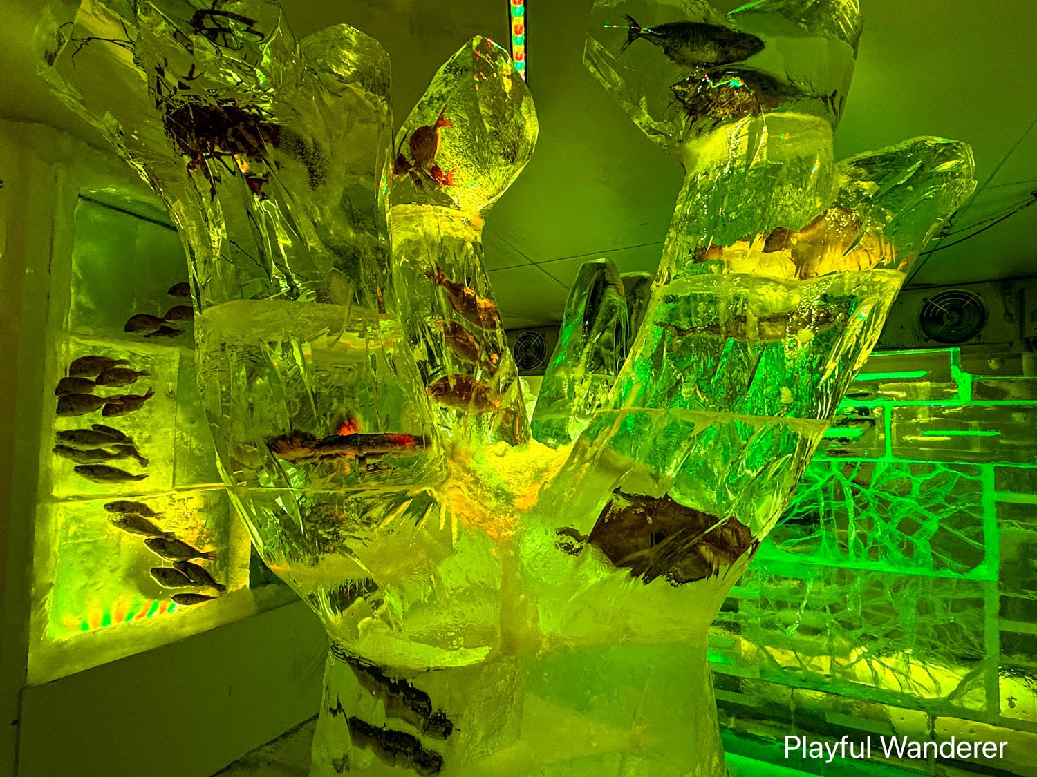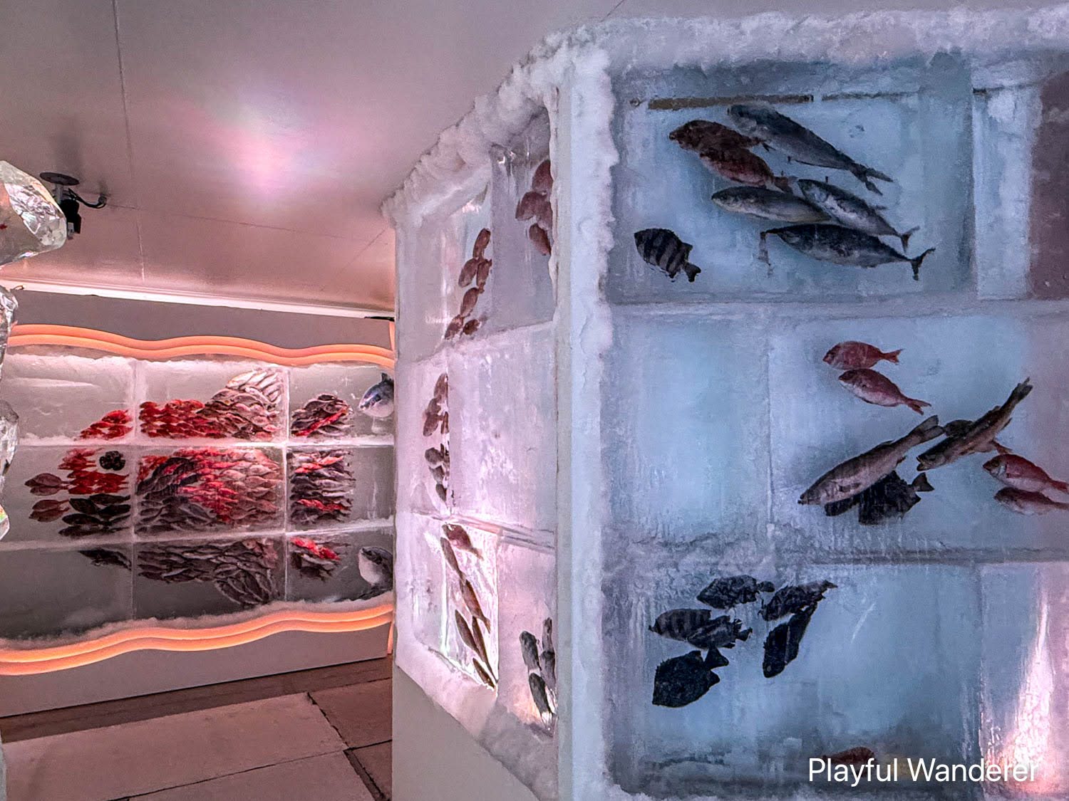 氷の水族館とは、ずばり氷に閉じ込めた鮮魚たちを海中風景になぞらえて展示している水族館。