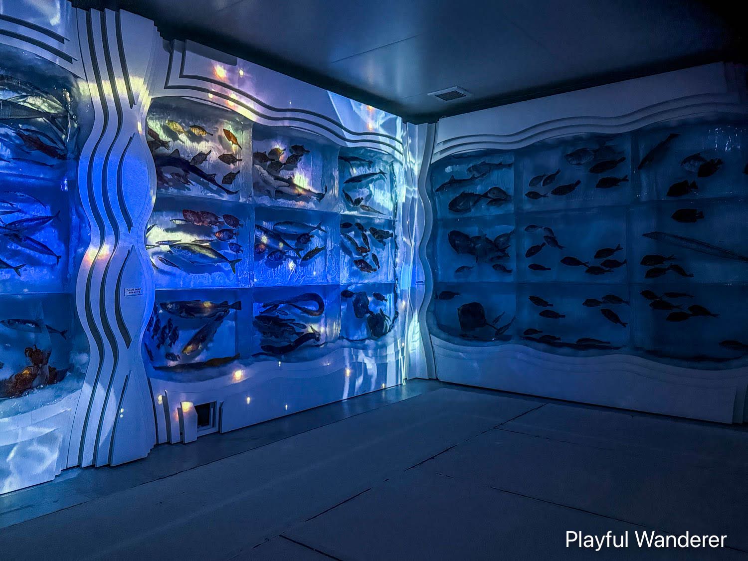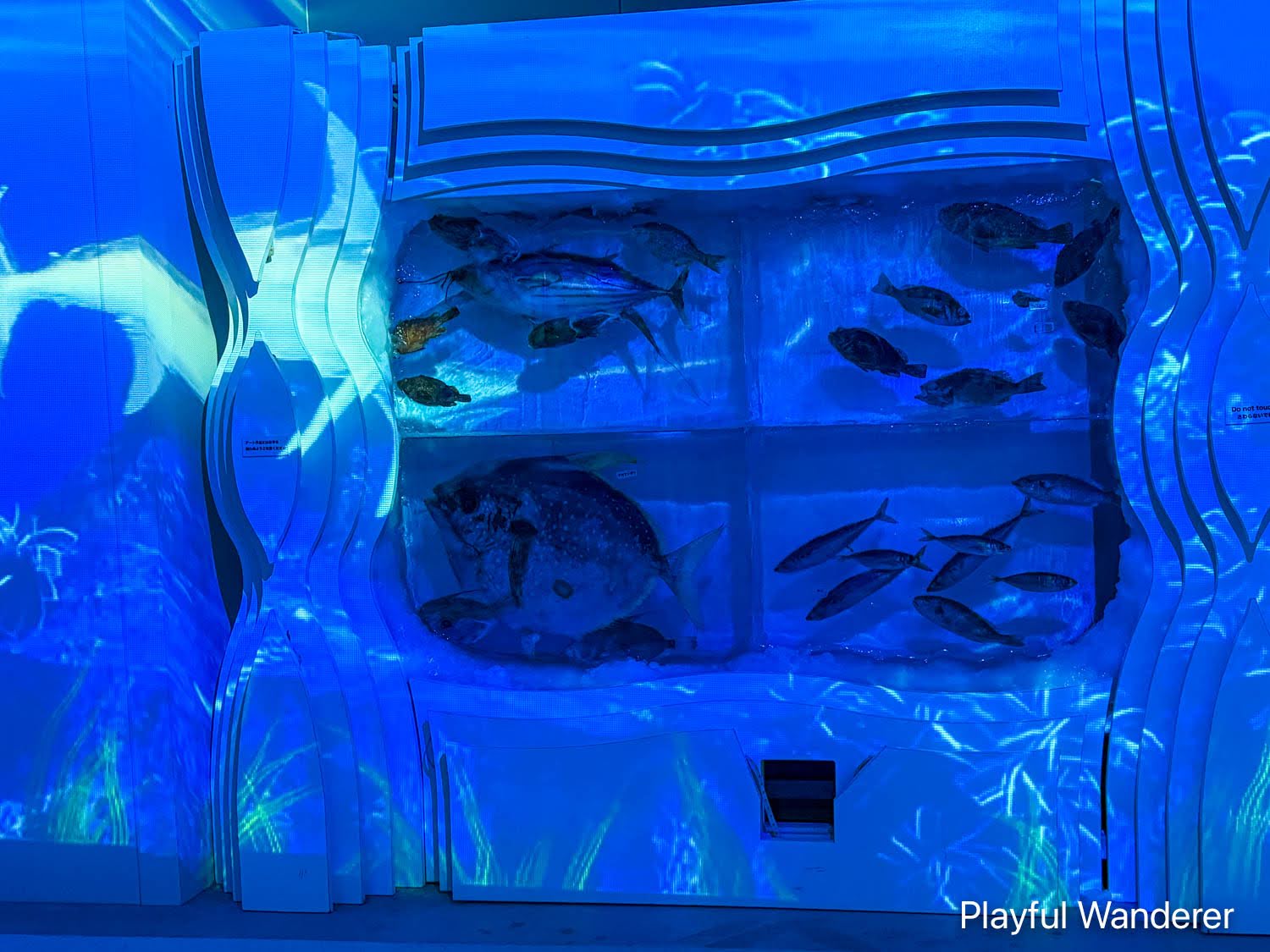 同じ展示でも色合いで表情を変える。ゆらめく水面や行き交う魚たちなどが映し出されます。
