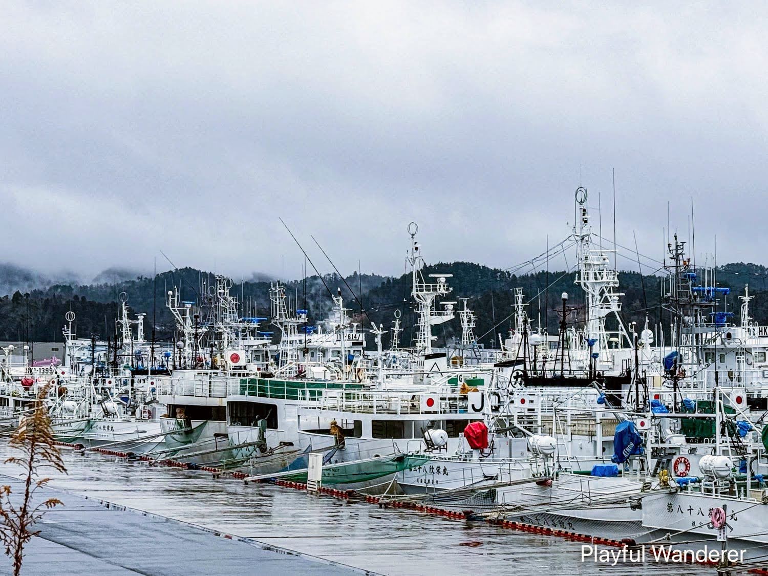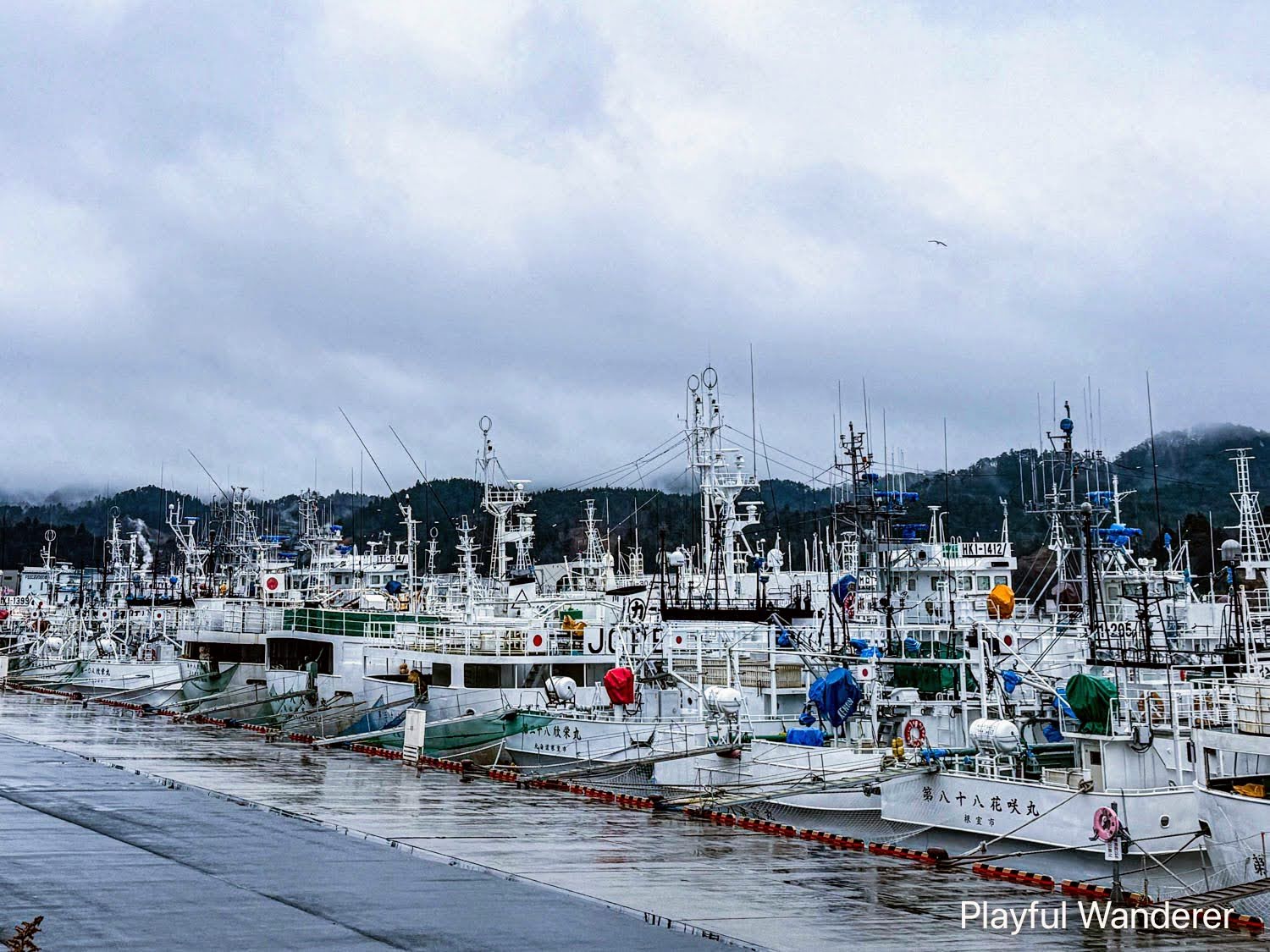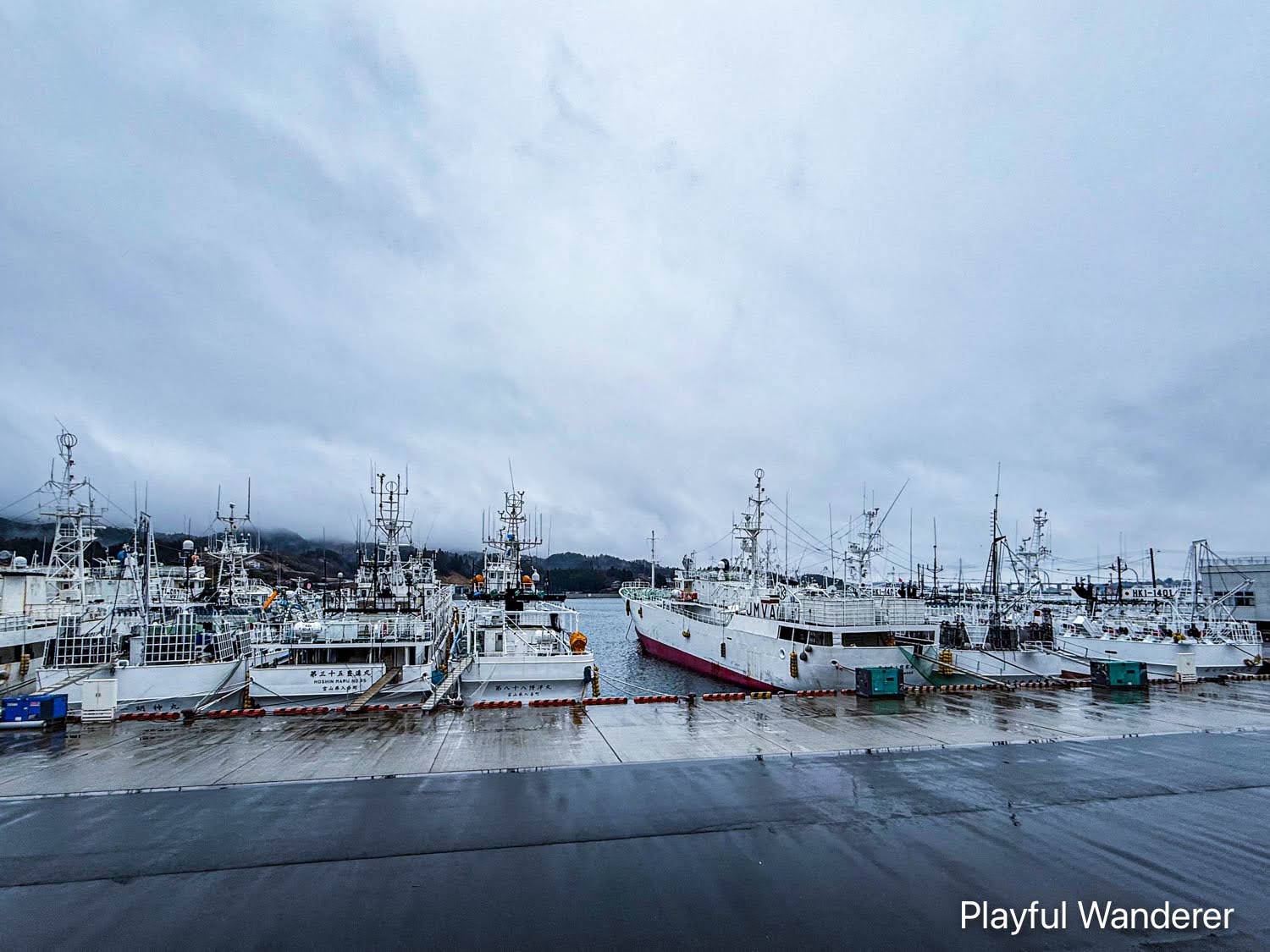 海の市とこの湾のちょっと先には漁港があるので、全国各地ならぬ海外からも大型の漁船がたくさん停泊していました。